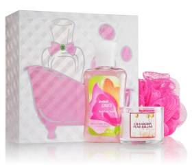 Includes 3 oz. Bubble Bath in Sweet Pea, Mini Candle in Cranberry Pear Bellini and a small pink Shower Sponge.